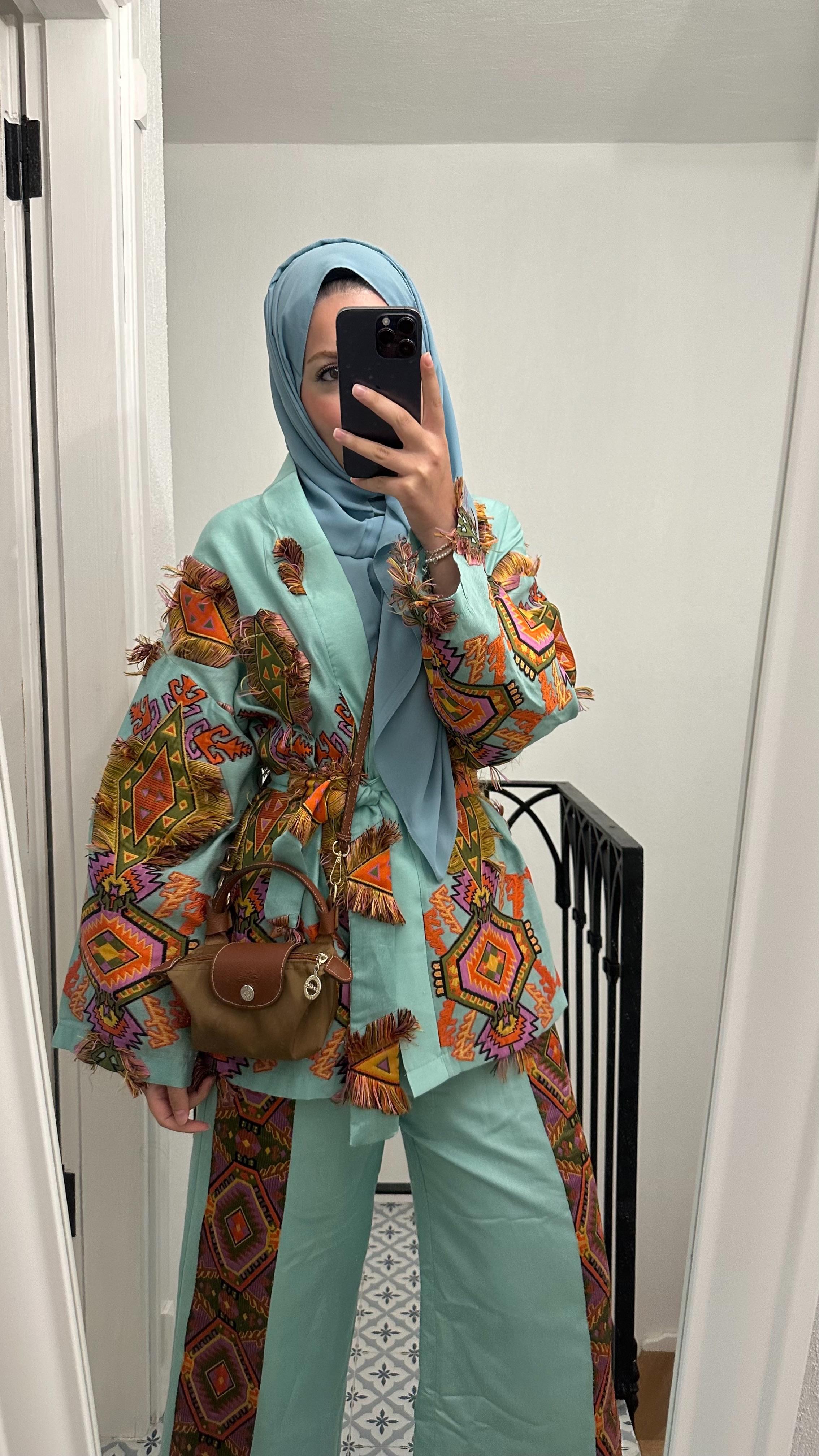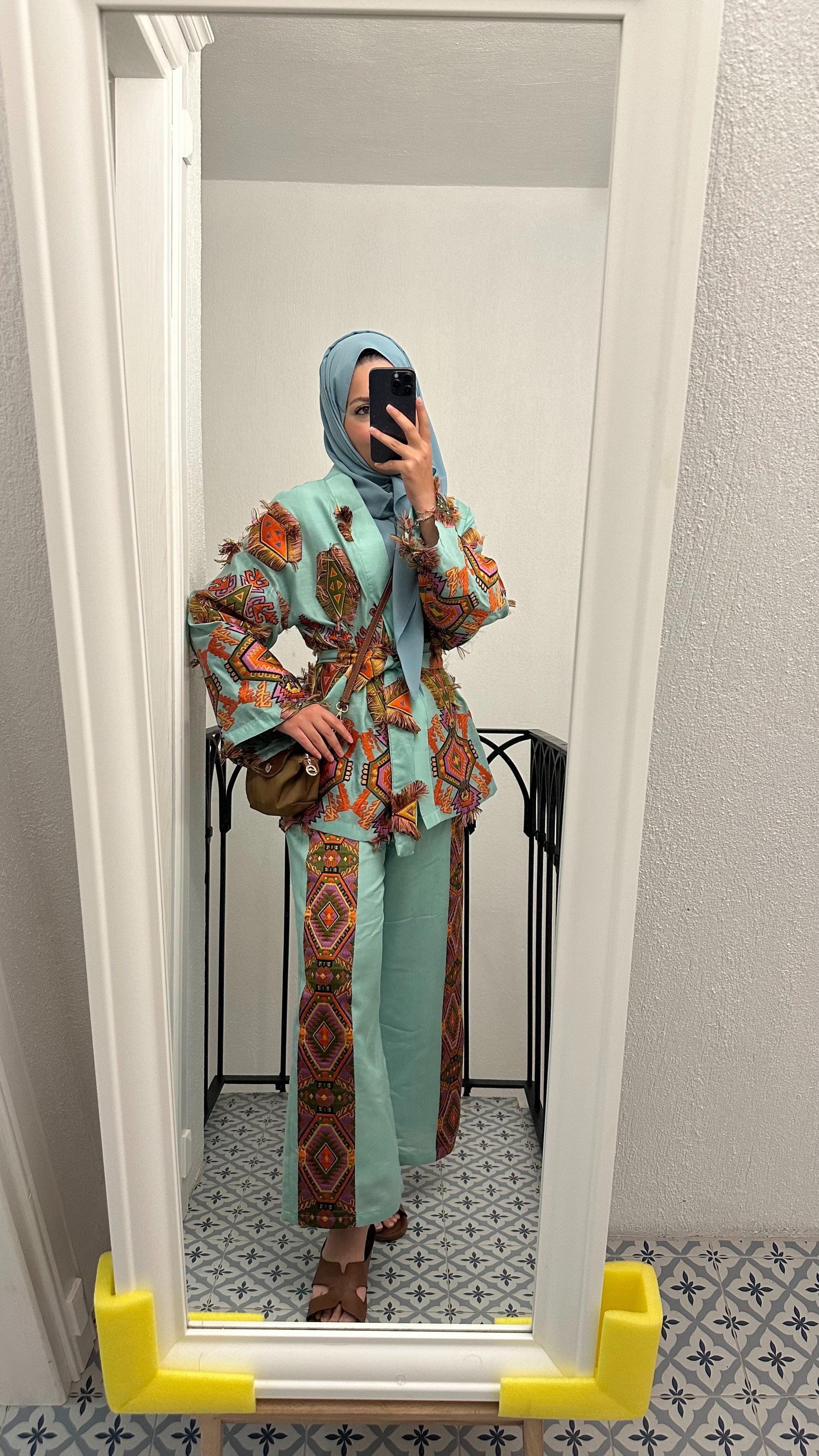 Viskon ve Jakar kumaş karıştırılarak üretilmiştir.